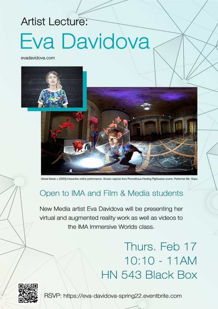 New Media artist Eva Davidova will be presenting her virtual and augmented reality work as well as videos to the IMA Immersive Worlds class.