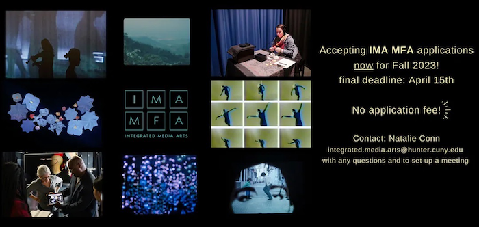 Integrated Media Arts MFA program (IMA MFA) at Hunter College is accepting applications now for Fall 2023 and until April 15th.