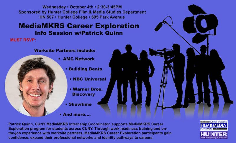 Patrick Quinn, CUNY MediaMKRS Internship Coordinator, supports MediaMKRS Career Exploration program for students across CUNY. Through work readiness training and on-the-job experience with worksite partners, MediaMKRS Career Exploration participants gain confidence, expand their professional networks and identify pathways to careers.