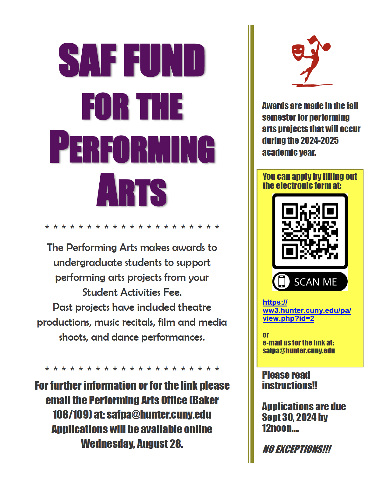 For further information please email the Performing Arts Office (Baker 108/109) at: safpa@hunter.cuny.edu
