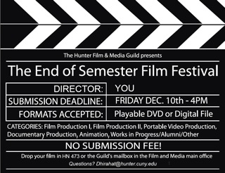 Hunter Student Film and Media Guild will be holding an End of Semester Film Festival and are now taking submissions until December 10th.