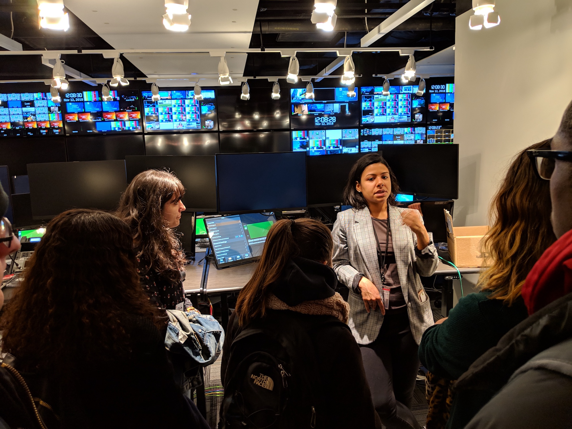 Leach, a CUNY Journalism School grad, walked students through the rim, the control rooms and the set of the show, explaining the rhythm of the work day for TV producers and the tensions involved in deadline work.