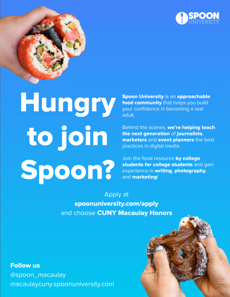 Join Spoon University, a food resource by college students for college students. Gain experience in writing, photography and marketing. Apply at spoonuniversity.com/apply and choose CUNY Macauley Honors. For more, here’s the chapter info: macaulaycuny.spoonuniversity.com