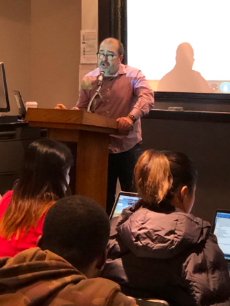 A senior ProPublica editor spoke to Hunter news literacy students on Nov. 14 about verifying information, using his own experience investigating an incident involving the New York Police Department on Halloween as a teachable moment.