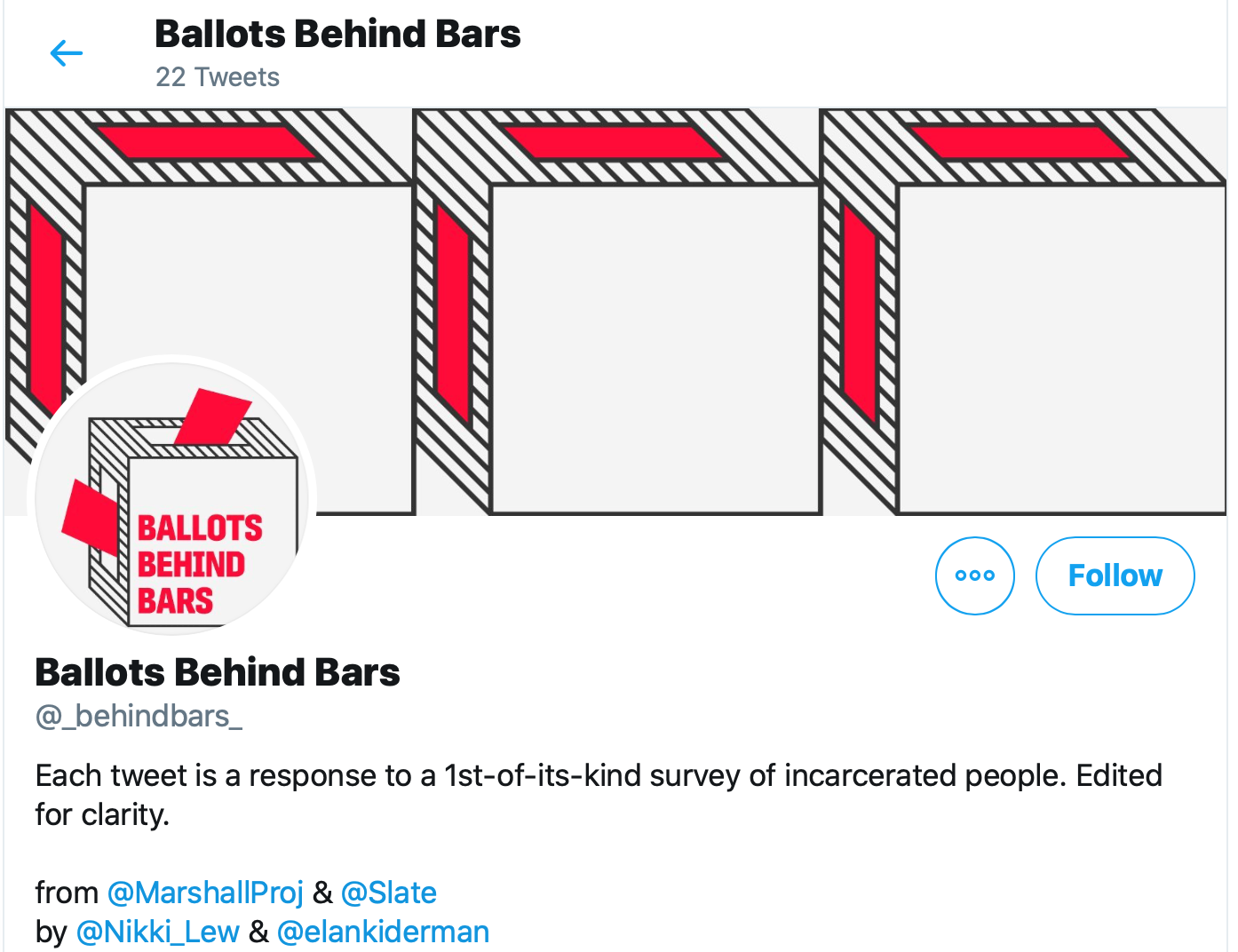 Reporting and Writing 1 Professor Nicole Lewis has been working on a new project to give incarcerated people a voice. In March, The Marshall Project and Slate published the results of a first-of-its-kind political survey in prisons and jails. More than 8,000 people responded, sharing their opinions on the current state of the world and its politics. People wrote letters detailing their political advocacy from the inside. Others expressed despair over being shut out. They heard from Trump supporters and people who would have voted for Warren if given the chance. The response was so huge that they couldn’t fit all of them into their original story. So they decided to share them on Twitter at @_behindbars_. You can also read the full story by Professor Lewis and Lawrence Bartley here.