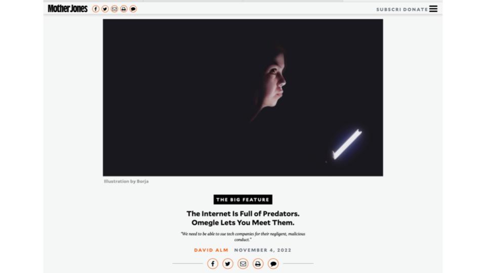 Professor David Alm’s latest investigative story takes aim at a video chat site known as Omegle. His piece, The Internet is Full of Predators. Omegle Lets You Meet Them, was recently published in Mother Jones.