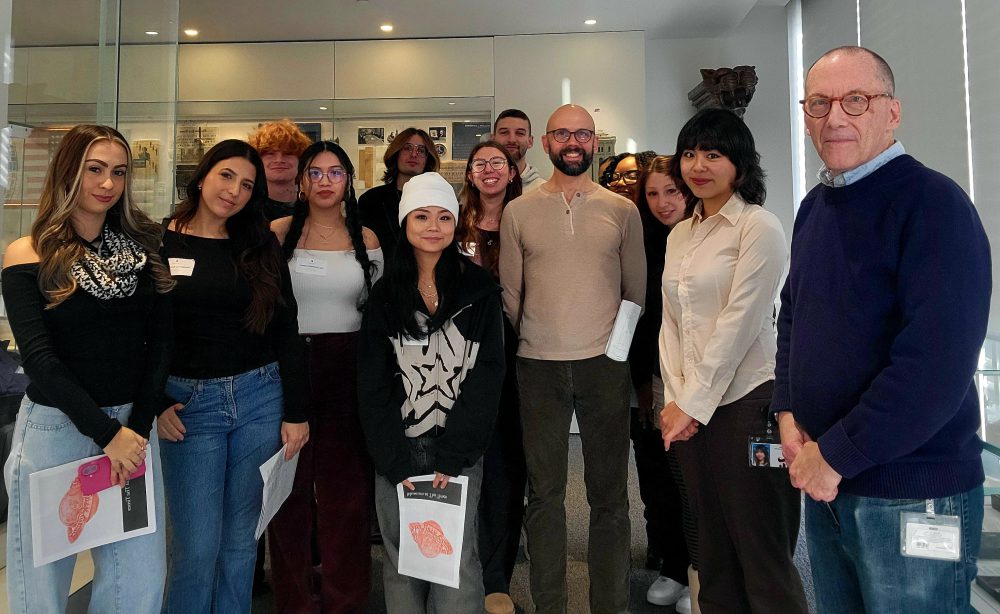 This fall, students in Professor David Alm’s Magazine Writing class visited The New York Times museum, where Stella Raine Chu, a former Hunter student and now a news assistant at the Times, and David Dunlap, a former Times reporter and now the curator of the museum, welcomed the group for a tour.