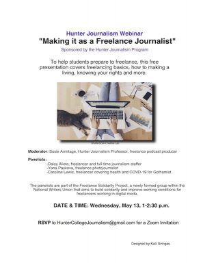Hunter Journalism is sponsoring a free webinar this Wednesday, May 13, from 1-2:30 p.m., to help students prepare to freelance. The presentation covers freelancing basics, how to make a living, knowing your rights and more. RSVP FOR THE ZOOM LINK.