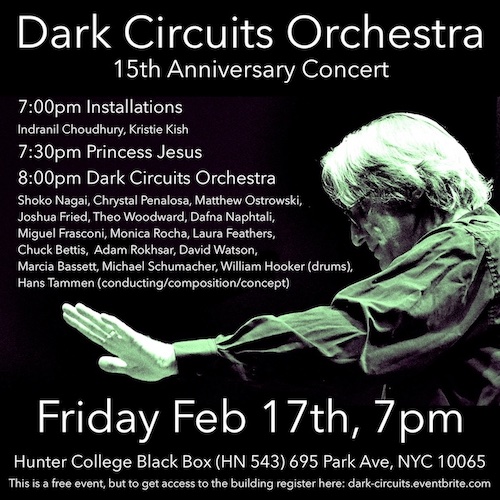 Dark Circuits Orchestra is a large ensemble devoted to contemporary electronic instrument practices such as circuit bending, no-input mixers, laptops, car steering wheels, analogue synthesizers, controllerism and other obscure approaches to electronics. Hans Tammen creates and conducts long multi-movement pieces with large groups of players of electronic instruments for almost 20 years. Dark Circuits Orchestra’s 15th Anniversary concert (well, add the pandemic years to it) will take place in Hunter College’s gorgeous Black Box Theater, preceded by sound and visual installations, and a performance of Princess Jesus.