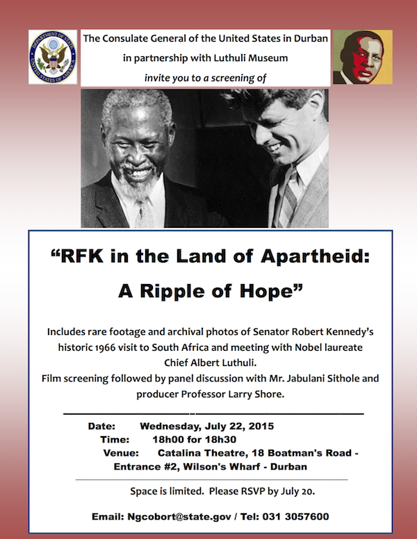 Producer Prof. Larry Shore’s “RFK in the Land of the Apartheid: A Ripple of Hope” screened at Catalina Theatre in Durban, South Africa. He is also featured on US Embassy’s South Africa site.