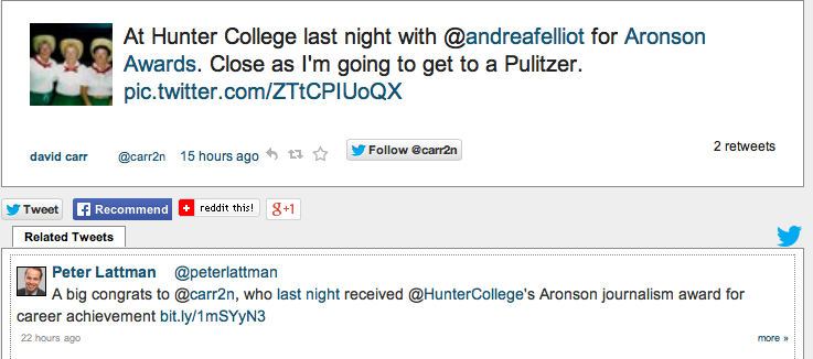 David Carr’s tweet about the Awards (Peter Lattman’s of the Times)